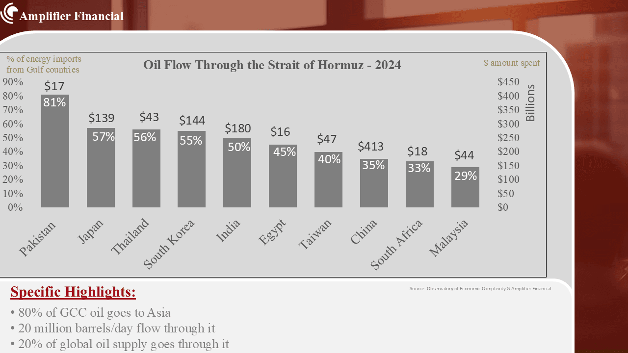 20 million barrels/day flow through the Strait of Hormuz, and roughly 80% of that goes to Asia. As a result, oil prices have surged above $100/barrel and it’s likely to significantly increase if disruptions persist.